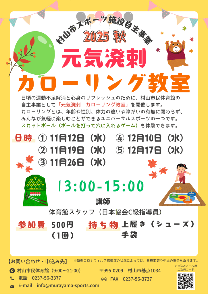 日頃の運動不足解消と心身のリフレッシュのために、村山市民体育館が自主事業として「元気溌剌(はつらつ)カローリング教室」を11月12日(水)から毎週水曜日に計5回開催します。